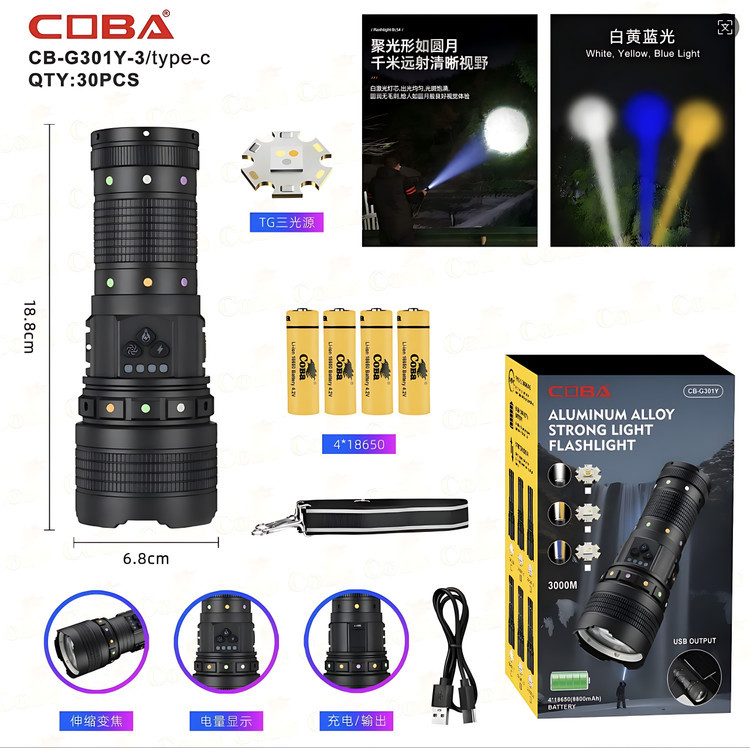 چراغ قوه COBA CB-G301Y-3 یک چراغقوه قدرتمند، حرفهای و چندمنظوره است که برای افرادی طراحی شده که به روشنایی قوی، دوام بالا و امکانات مدرن نیاز دارند. این محصول با بدنهی مقاوم از آلیاژ آلومینیوم، در برابر ضربه، سایش و لغزش مقاوم بوده و گزینهای ایدهآل برای استفاده در فضای باز، کمپینگ، سفر، خودرو و شرایط اضطراری محسوب میشود