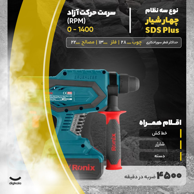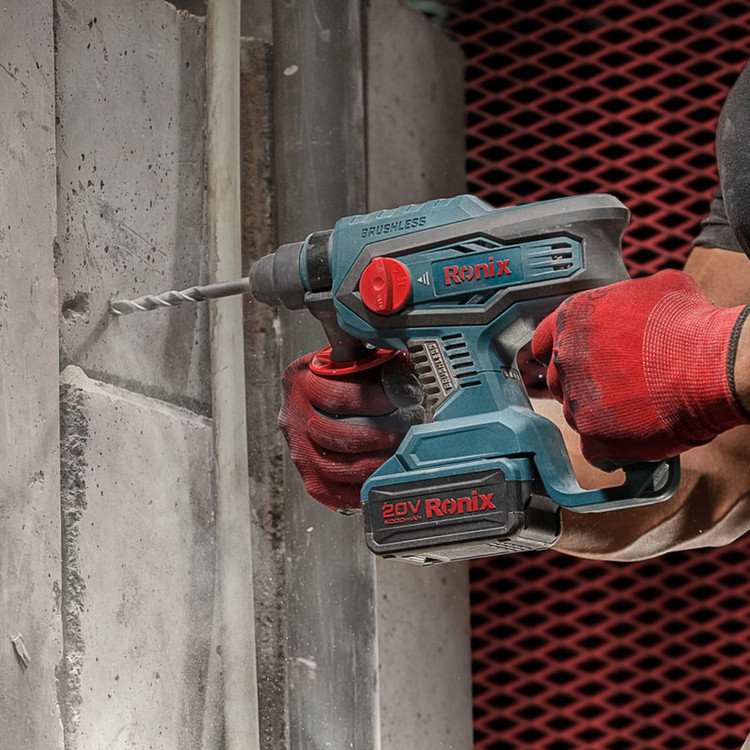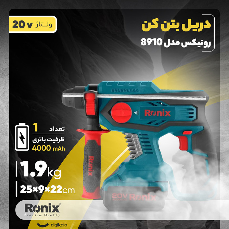 دریل بتن کن شارژی رونیکس مدل 8910، با ترکیب قدرت یک موتور براشلس و آزادی عمل باتری، یک ابزار حرفهای برای کاربریهای صنعتی و کارگاهی است. این دریل از برند رونیکس، نیروی خود را از یک باتری ۲۰ ولتی سری براشلس تأمین میکند. موتور براشلس آن، علاوه بر افزایش طول عمر دستگاه، قدرت و بازدهی بالاتری را برای سوراخکاری و تخریب در سختترین سطوح فراهم میآورد. این دستگاه قابلیت سوراخکاری تا قطر ۲۲ میلیمتر در مصالح، ۲۸ میلیمتر در چوب و ۱۳ میلیمتر در فلز را دارد. سیستم سهنظام این بتن کن از نوع حرفهای SDS Plus یا چهار شیار است که تعویض سریع و ایمن مته و قلم را ممکن میسازد. از ویژگیهای کاربردی آن میتوان به قابلیت کنترل سرعت، سیستم گردش چپگرد و راستگرد و قفل سوییچ برای استفادههای مداوم اشاره کرد. این دریل بتن کن ساخت کشور چین، با وزن تنها ۱.۹ کیلوگرم، ابزاری سبک و خوشدست برای کار در شرایط مختلف است. به همراه این محصول، اقلامی مانند دسته کمکی، خط کش عمقسنج و شارژر نیز ارائه میشود. در نهایت، دریل بتن کن رونیکس 8910 برای متخصصانی که به دنبال قدرت، دوام و آزادی عمل در محیط کار خود هستند، یک انتخاب بینقص است.